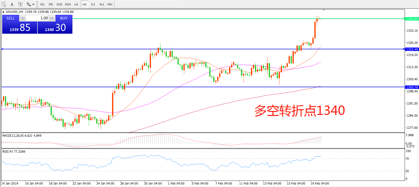 周二(2月19日)美盘时段,美元指数短线加速下滑近70点,走出倒V反转行情。在美元冲高回落之际,金价强势上扬,突破1340美元/盎司,最高触及1341.78美元/盎司,日内大涨逾1%。由于突破了1340的重要阻力位,创下的10个月新高的黄金了能会再度会开启一波上行上行趋势。