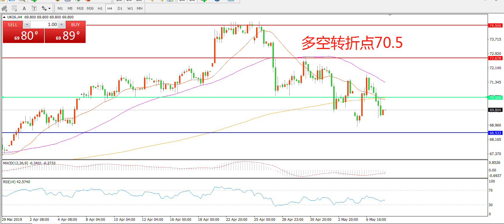 4小时图看,布油呈现震荡回落走势,短期均线呈空头排列,21均线下穿形成成死叉,MACD绿柱减少, RSI指标走平,重点关注70.5一线得失。