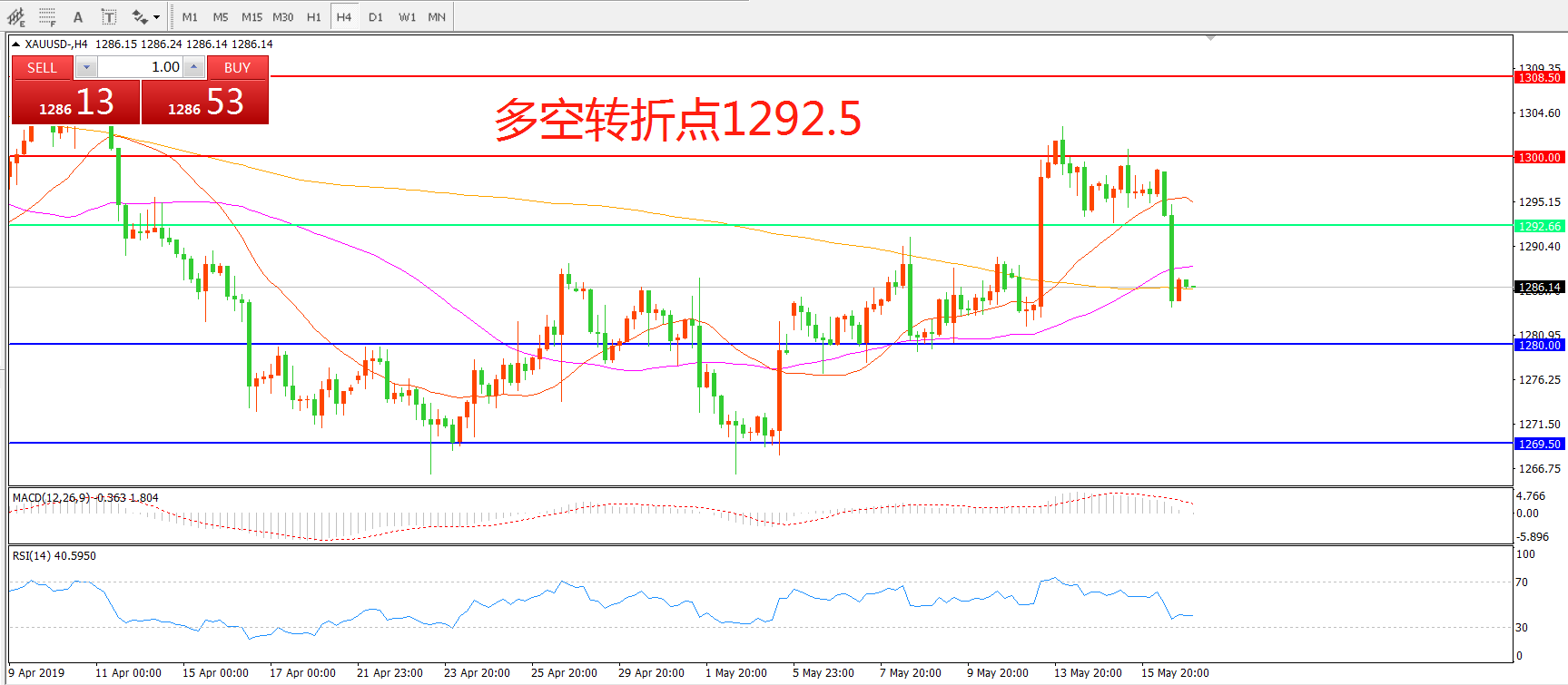 周四美国数据数据表现靓丽,美国4月房屋营建增幅高于预期,美国4月新屋开工总数年化高于预期,上周首次申请失业救济人数降幅也超出预期,强劲的数据表现推动美元上涨,现货黄金周四(5月16日)持续走低,最终收报1286.26美元/盎司,但中美贸易冲突在全球市场上继续存在,如有反复,避险情绪将再次为黄金提供一定支撑。