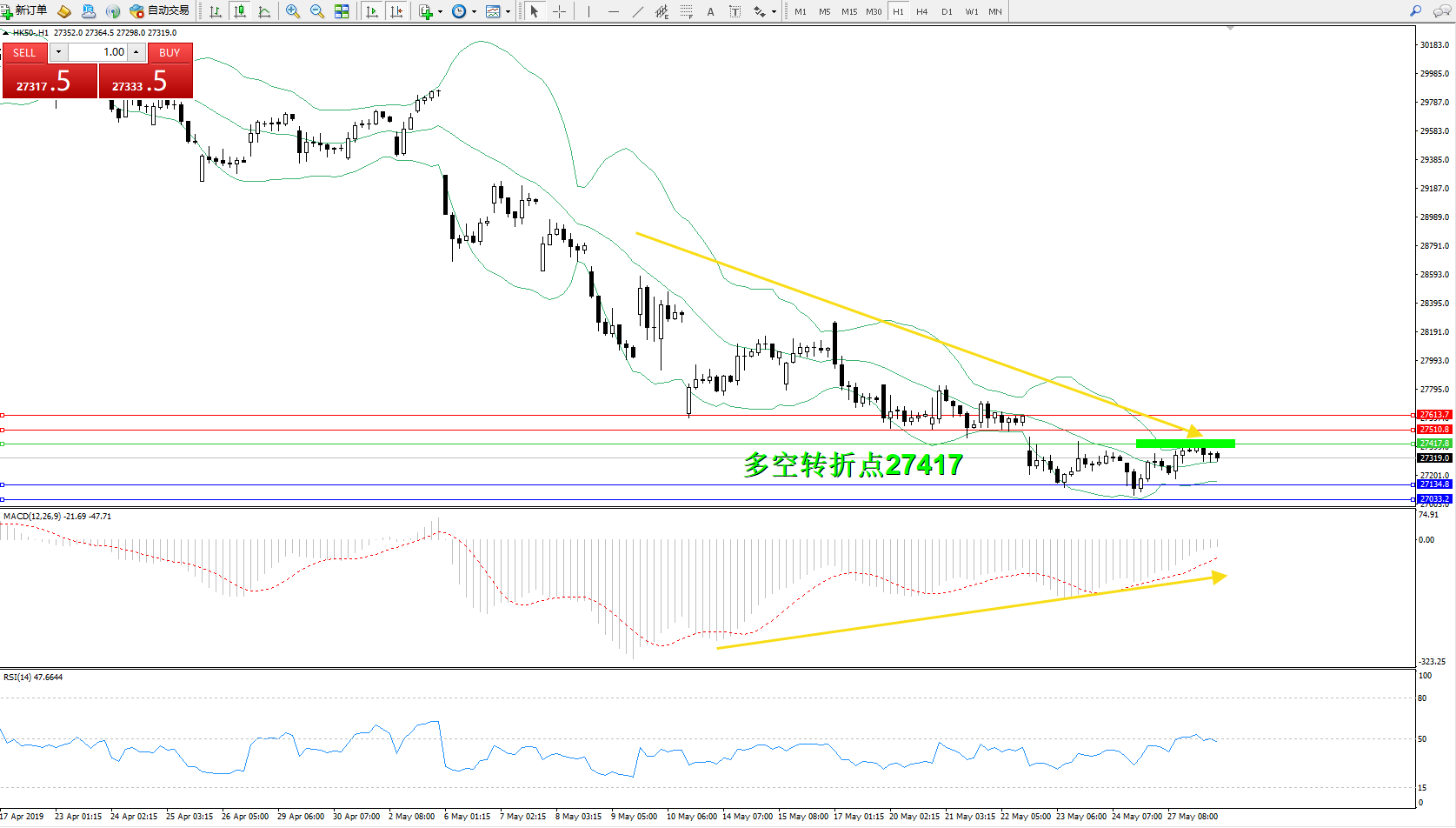 恒指HK50 ——1小时K线图显示: