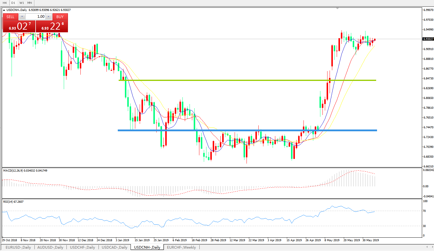 美元人民币USDCNH——日线图K线图显示: