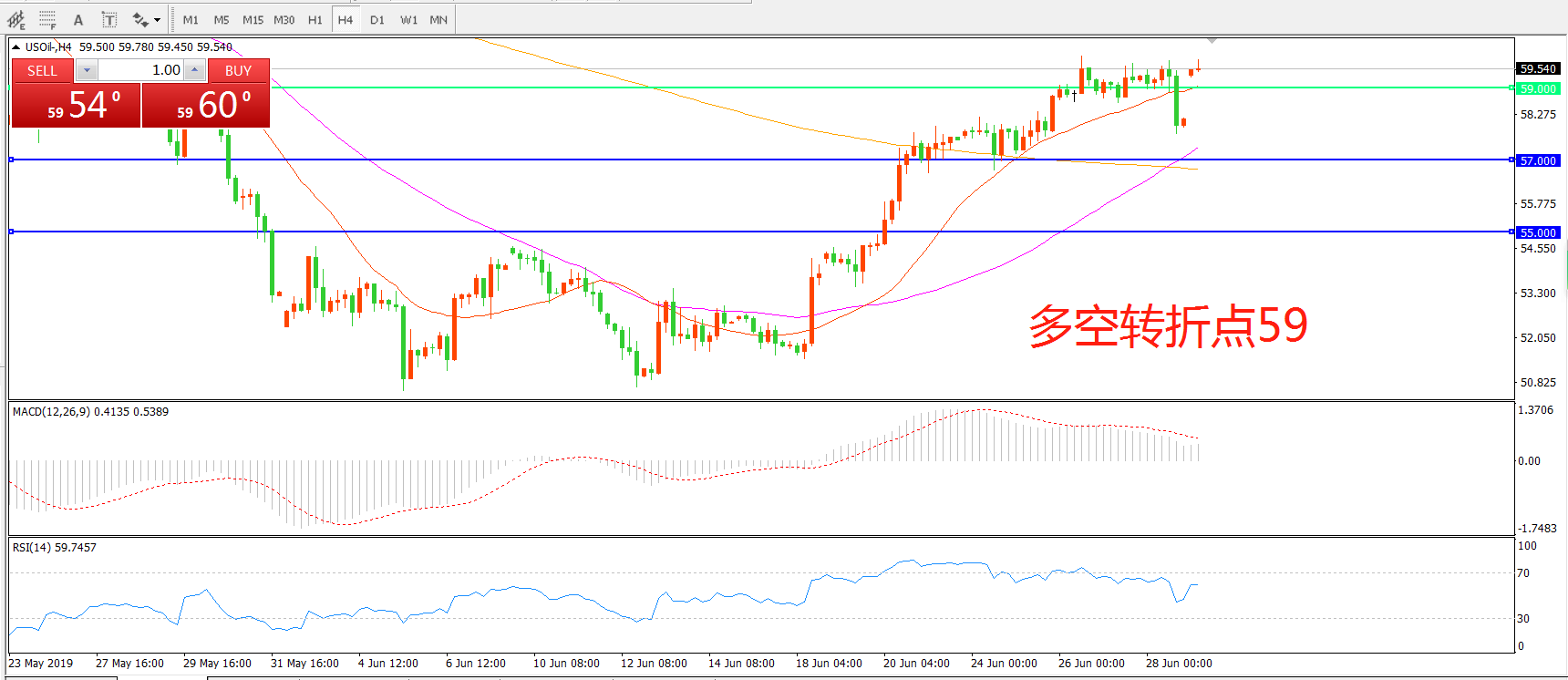 4小时图看,油价跳空高开,再次站在59一线之上, 均线系统开始拐头,MACD红柱减少, RSI指标走平,日内区间震荡概率较大。