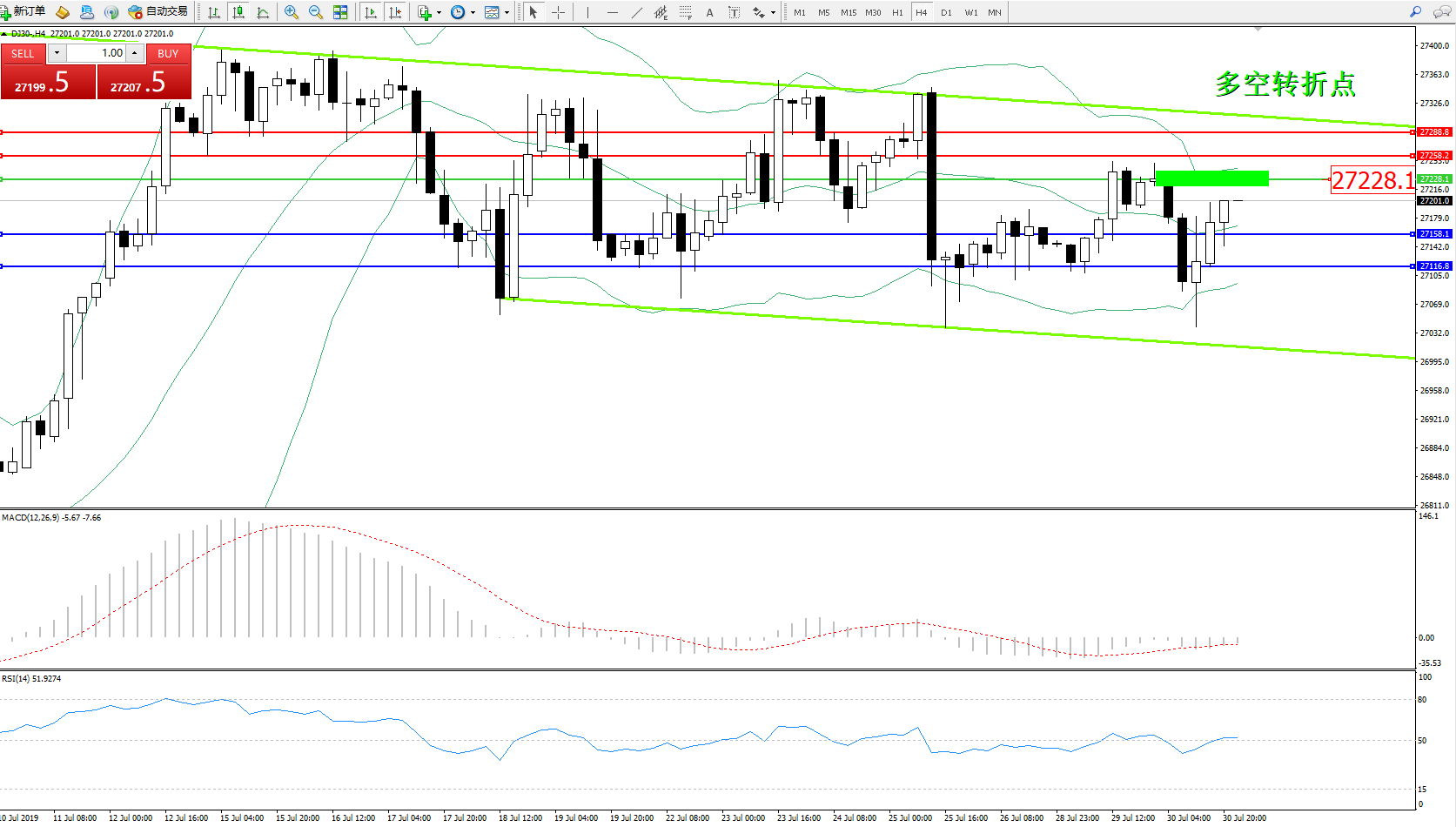 道琼斯指数7月30日(周二)收盘下跌23.30点,跌幅0.09%,报27198.02点。投资者都在密切关注本周四凌晨美联储即将公布的最新的决议内容,鉴于美国之外的经济体增速放缓的风险,目前市场普遍预期美联储将降息25基点。美国总统唐纳德特朗普表示,小幅降息“还不够”。对美联储感到失望。希望看到美联储大幅降息以及停止量化紧缩。