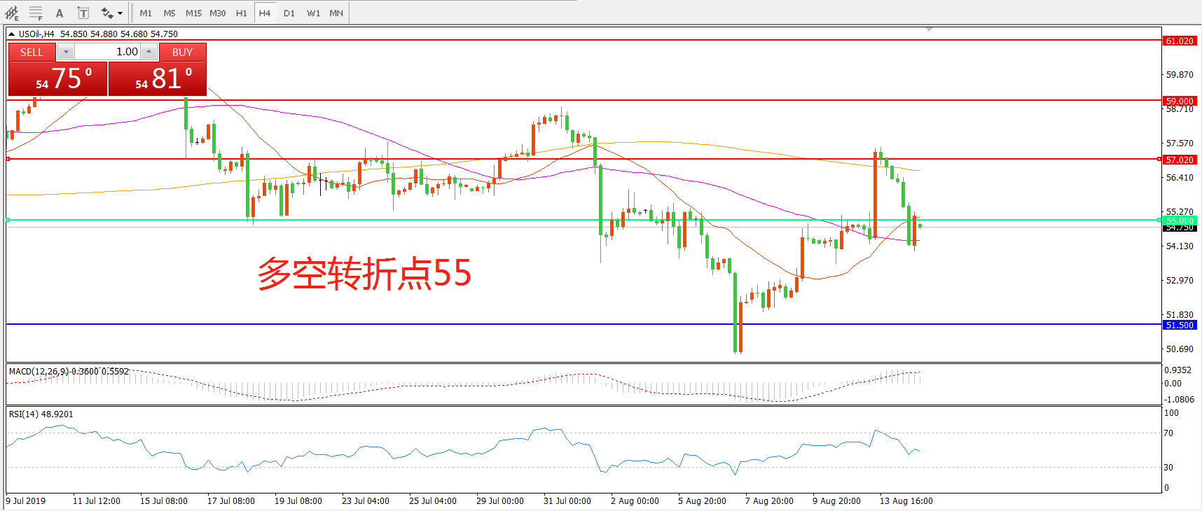 周三(8月14日),美国EIA公布的数据显示,截至8月9日当周美国除却战略储备的商业原油库存增幅超过预期,汽油和精炼油库存大幅减少,整体表现差强人意。但美国2年期和10年期国债收益率曲线自2007年来首次出现倒挂,中国最新出炉的7月工业和消费数据也均逊于预期引发市场对世界经济衰退的担忧,美国WTI原油重挫近5%,收报54.76美元/桶。