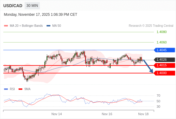 交易策略: 在 1.4045 之下,看跌,目标价位为 1.4015 ,然后为 1.4000 。