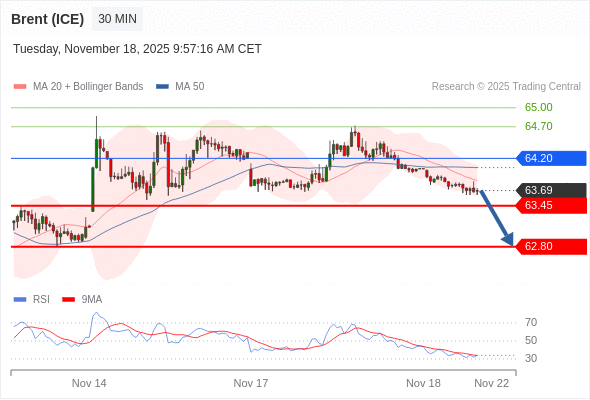 在 64.20 之下,看跌,目标价位为 63.45 ,然后为 62.80 。