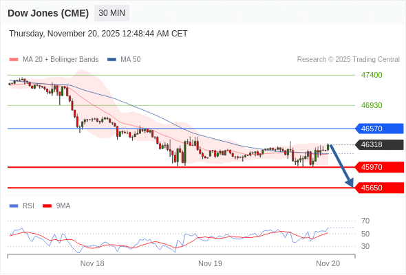 在 46570 之下,看跌,目标价位为 45970 ,然后为 45650 。