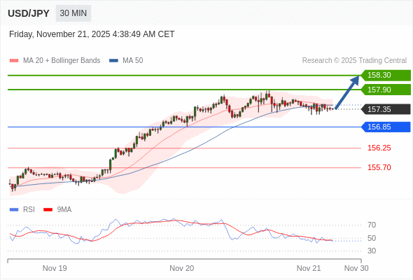 在 156.85 之上,看涨,目标价位为 157.90 ,然后为 158.30 。