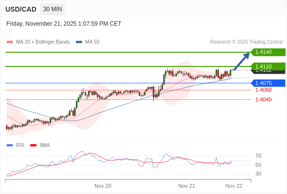 在 1.4075 之上,看涨,目标价位为 1.4110 ,然后为 1.4140 。