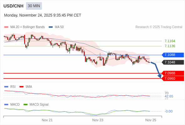 美元/人民币 当日内 : 看跌,在 7.1088 之下。