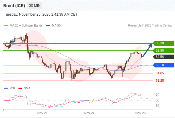 在 62.10 之上,看涨,目标价位为 62.90 ,然后为 63.30 。