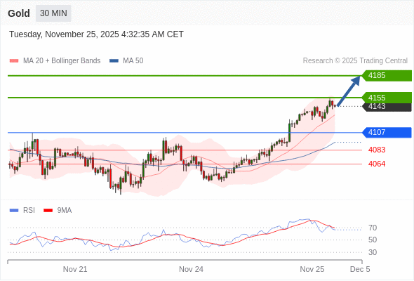 在 4107 之上,看涨,目标价位为 4155 ,然后为 4185 。