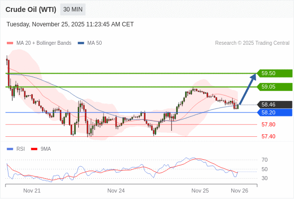 在 58.20 之上,看涨,目标价位为 59.05 ,然后为 59.50 。