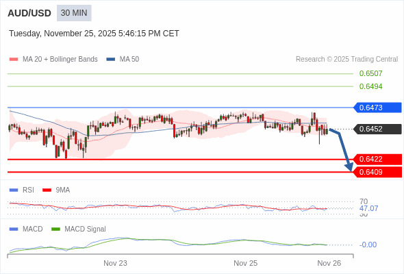 澳元/美元 当日内 : 看跌,在 0.6473 之下。