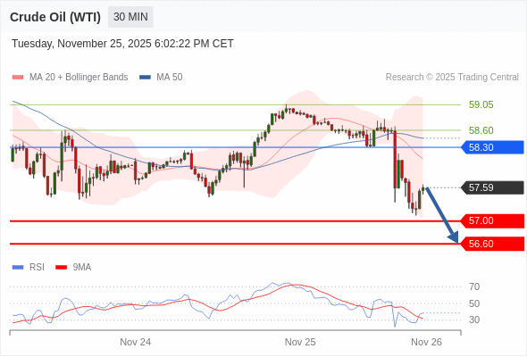 在 58.30 之下,看跌,目标价位为 57.00 ,然后为 56.60 。