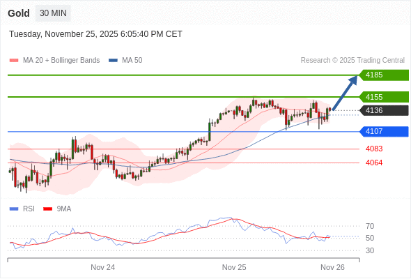 在 4107 之上,看涨,目标价位为 4155 ,然后为 4185 。