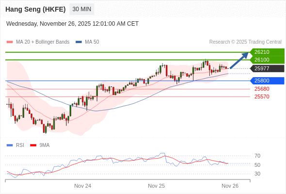 在 25800 之上,看涨,目标价位为 26100 ,然后为 26210 。
