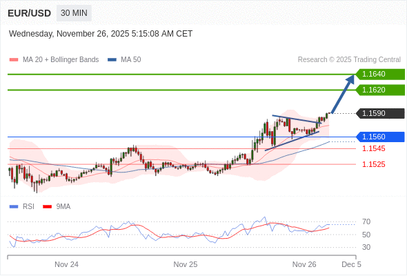 在 1.1560 之上,看涨,目标价位为 1.1620 ,然后为 1.1640 。
