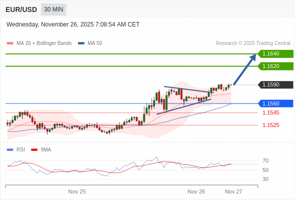 在 1.1560 之上,看涨,目标价位为 1.1620 ,然后为 1.1640 。