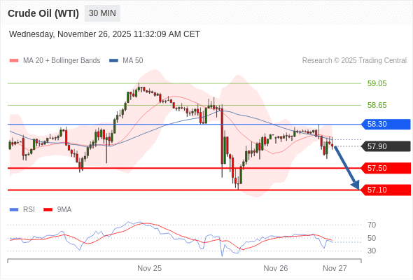 在 58.30 之下,看跌,目标价位为 57.50 ,然后为 57.10 。
