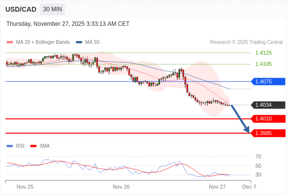美元/加元 当日内: 朝1.4010运行。