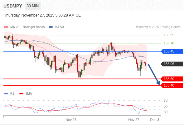 在 156.45 之下,看跌,目标价位为 155.60 ,然后为 155.40 。