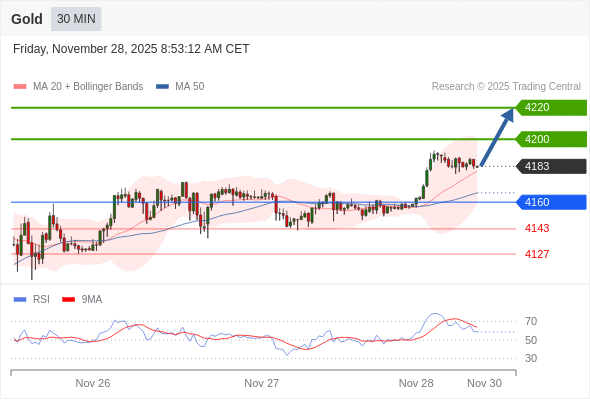 在 4160 之上,看涨,目标价位为 4200 ,然后为 4220 。