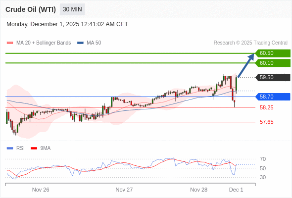 在 58.70 之上,看涨,目标价位为 60.10 ,然后为 60.50 。