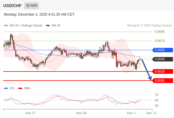 在 0.8055 之下,看跌,目标价位为 0.8020 ,然后为 0.8005 。