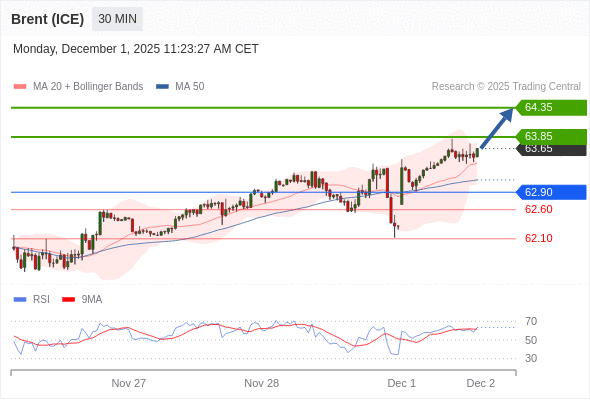 在 62.90 之上,看涨,目标价位为 63.85 ,然后为 64.35 。