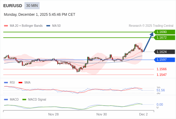 欧元/美元 当日内 : 看涨,当 1.1597 为支撑位,目标定在1.1690。