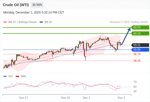 在 59.00 之上,看涨,目标价位为 60.10 ,然后为 60.50 。