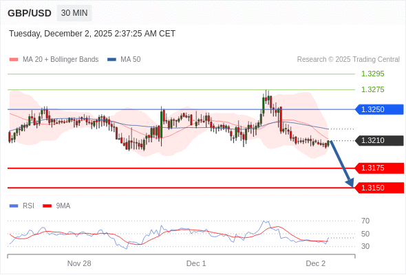 在 1.3250 之下,看跌,目标价位为 1.3175 ,然后为 1.3150 。