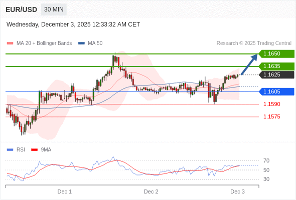 在 1.1605 之上,看涨,目标价位为 1.1635 ,然后为 1.1650 。