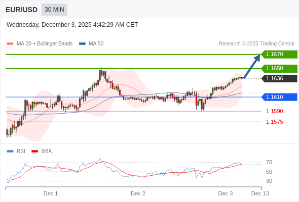 在 1.1610 之上,看涨,目标价位为 1.1650 ,然后为 1.1670 。
