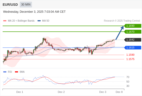 在 1.1615 之上,看涨,目标价位为 1.1670 ,然后为 1.1690 。