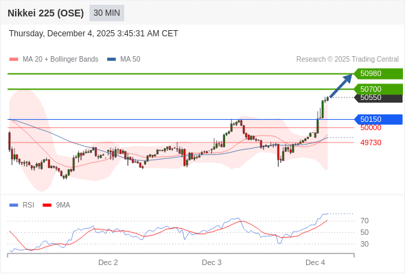 在 50150 之上,看涨,目标价位为 50700 ,然后为 50980 。