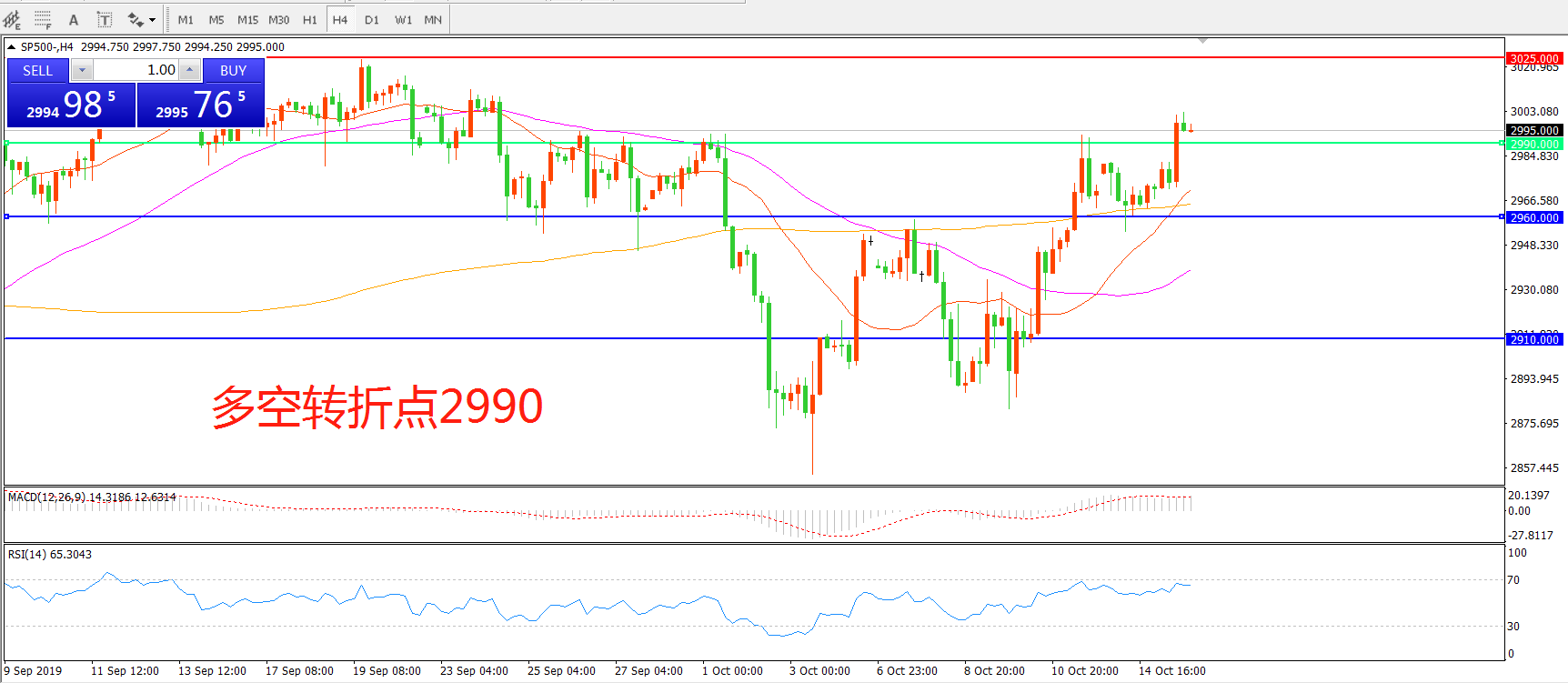 4小时图看,标普500长阳反弹,突破前期整理区间,均线系统拐头向上,MACD红柱增加,RSI指标走平,日内延续上行概率较大。