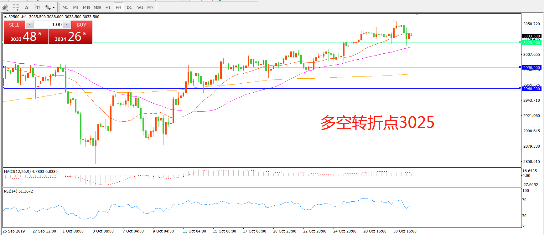 4小时图看,标普500高位震荡回落,退守3025支撑,均线系统走平,MACD红柱减少,RSI指标走平,日内小幅调整概率较大。