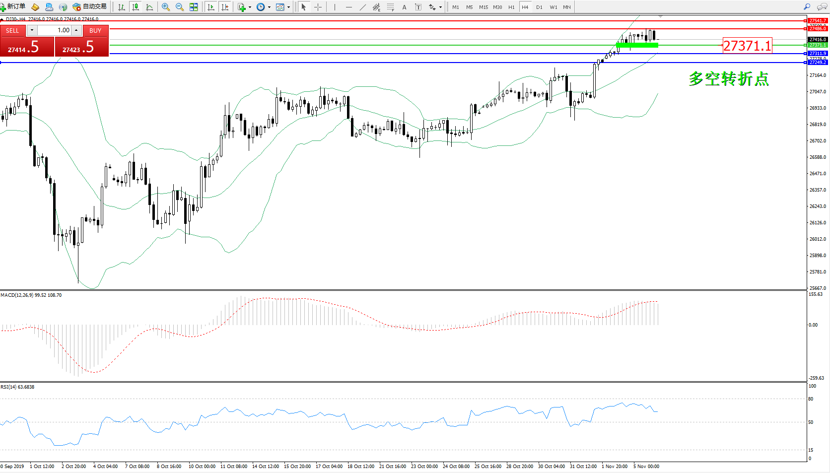 道琼斯指数11月5日(周二)收盘上涨30.50点,涨幅0.11%,报27492.63点。围绕中美贸易谈判的乐观情绪以及良好的美国经济数据推动美债收益率再度上升,强劲的招聘和订单提振ISM非制造业指数从三年低点回升,能源板块领涨,其次是金融板块;房地产板块领跌,其次是公用事业板块。市场仍在权衡国际贸易协议的前景、乐观的经济数据以及美国联邦政府关门的可能性。