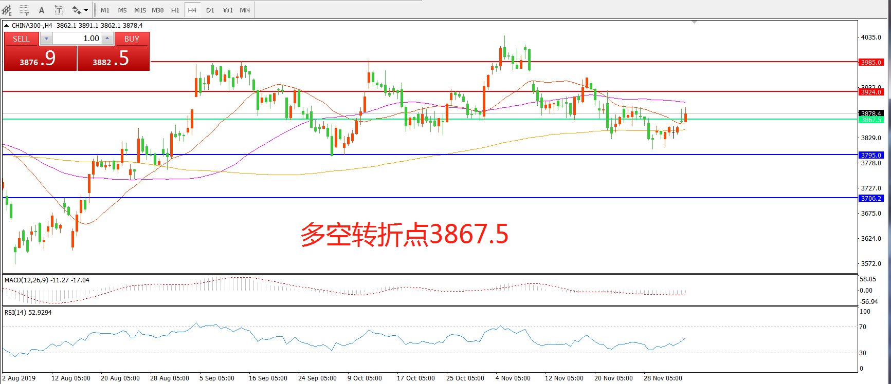 4小时图看,沪深300延续低位震荡,整体走势有所回暖,均线系统走平,MACD绿柱增加,RSI指标向上,日内延续震荡概率较大。