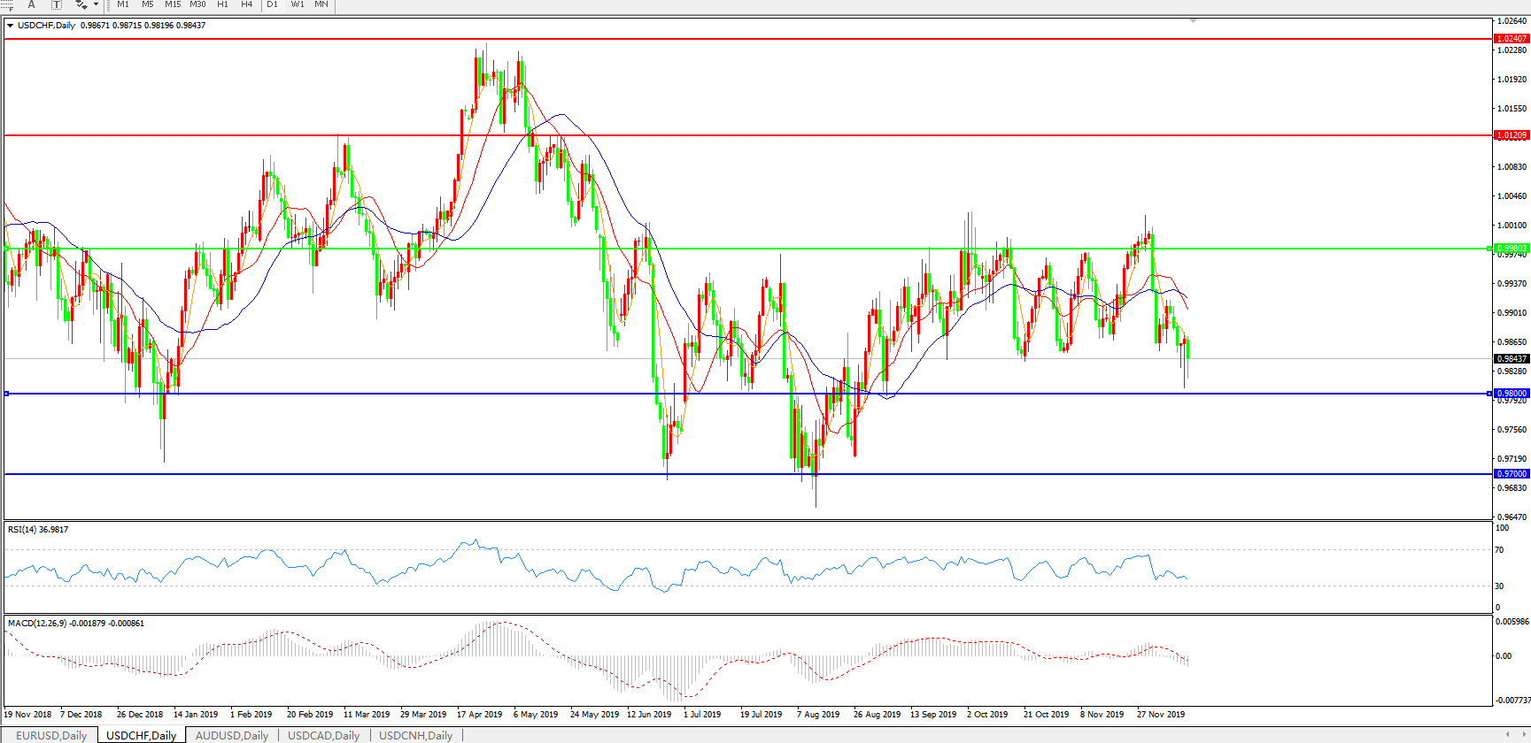 美元兑瑞郎在周四欧洲时段盘初持于隔夜以来低位,最低触及9月初以来的新低0.9813。日内瑞士央行发布了政策决议,维持存款利率在-0.75%不变,但瑞士央行的措辞同样偏向鸽派,因此美元兑瑞郎续跌空间受限; 瑞士央行强调,当前仍不放弃在“有必要时”及时入市干预汇率的承诺,称全球经济仍然存在下行风险,因此超常宽松货币政策依旧有必要,这与隔夜美联储主席鲍威尔的言论几乎如出一辙;因此,市场预期中美元兑瑞郎续跌的行情并未出现; 市场目光因此转向此后欧洲央行的政策决议,如果欧洲央行宽松措辞力度不及预期,就可能令其在本周公布政策决议的各家央行中“鹤立鸡群”,并令欧元汇价出现跳涨。