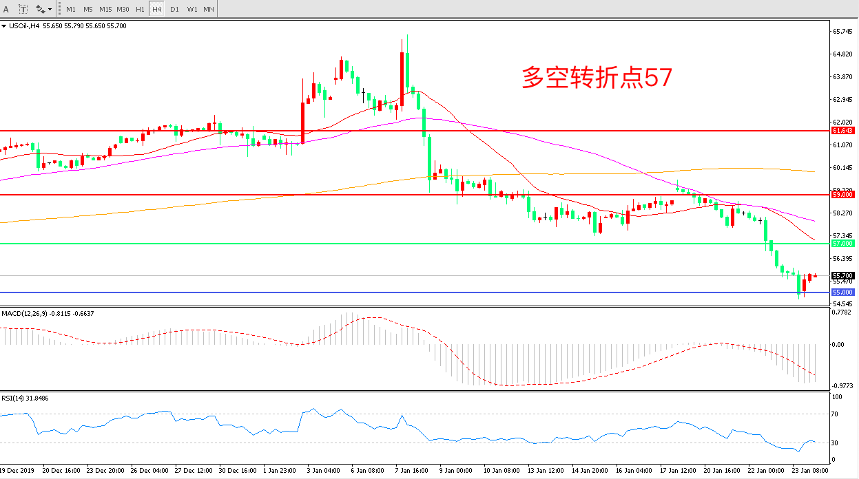 交易策略:在57.00之下看跌,目标55.00         52.00