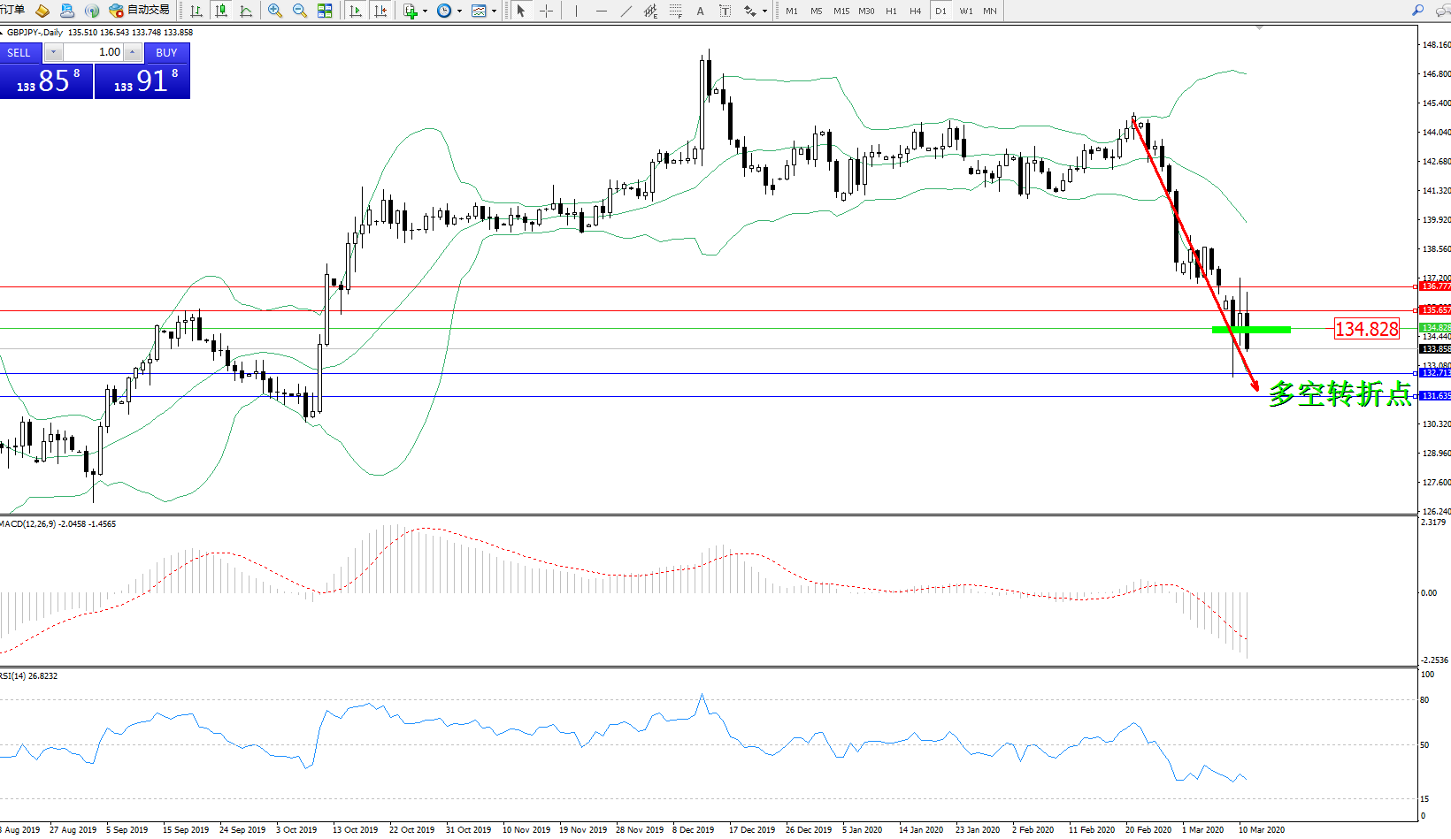 交易策略:134.828下方看跌,目标132.713131.635