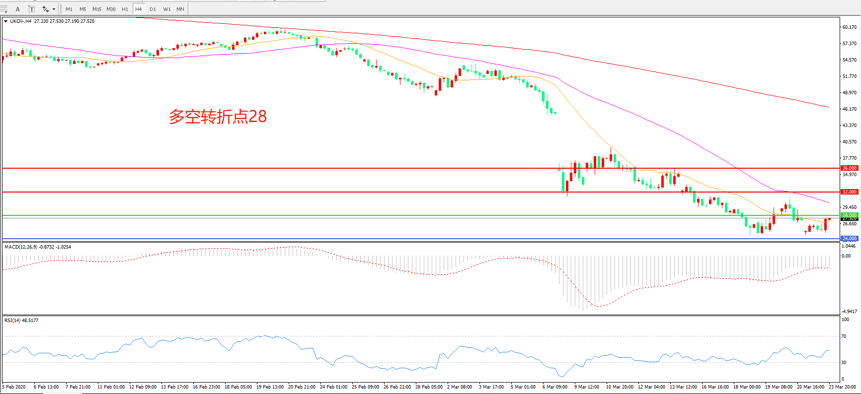 周一(3月23日),美国国会参议院未能就一项纾困计划达成一致使得原油和其他高风险资产继续承压,但随后,美联储再度召开紧急会议,放出“王炸”,宣布购买无限量的政府债券和投资级公司债券,这是美联储迄今为止最激进的市场干预行动。在乐观情绪的推动下, 布伦特原油出现探底回升,收报27.52美元/桶。