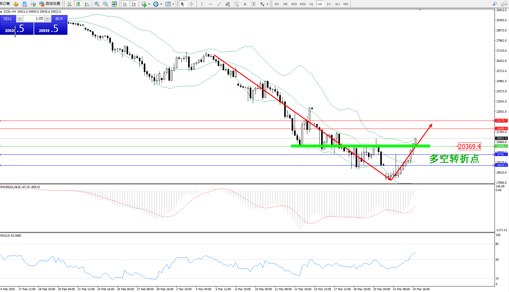 道琼斯指数3月24日(周二)收盘上涨2113.00点,涨幅11.37%,报20704.91点。欧美股市暴涨,道指涨逾11%,创下1933年以来的最大单日涨幅。美国国会接近达成史无前例的经济刺激法案,推动风险偏好急剧升温。正在协商规模约2万亿美元抗疫刺激法案的最后症结。美国股市对这一庞大的财政刺激前景以及两党谈判进展做出反应。被迫抛售的绝对疯狂可能已经结束,现在有将近一万亿美元的资金等待流入股市。市场情绪有所回暖,但现在称之为拐点还有些过头,这更像是一场拉锯战。刺激政策火箭炮已经到位,将与非常疲软的经济数据和令人担忧的疫情趋势作战。投资者等待美国参议院通过经济刺激法案,以缓和新冠病毒扩散对经济的冲击,且美国总统特朗普敦促美国在4月中前重新恢复经济活动。