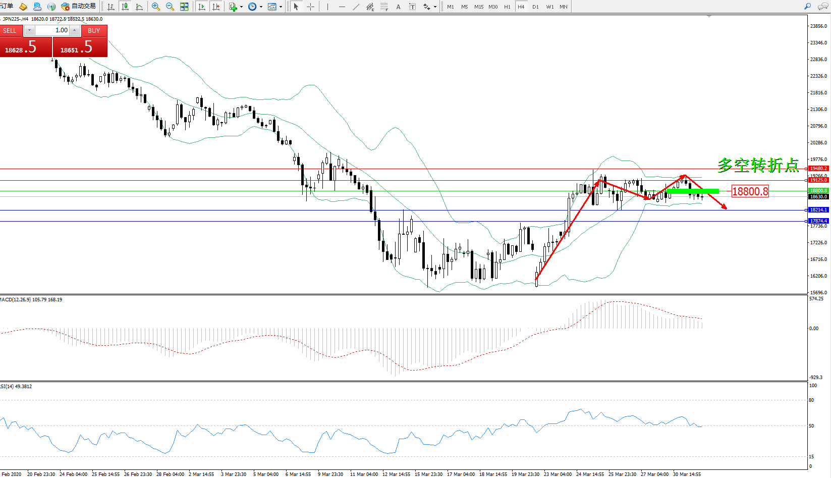日经225指数3月31日(周二)收盘下跌236.97点,跌幅1.24%,报18848.00点。日内风险偏好情绪回暖,中国方面数据也向好,而美国料采取新一轮经济刺激计划,亚洲股市纷纷走高,同时日本国内新冠感染病例超过2000例,日本疫情有所恶化,日本首相安倍晋三:疫情给日本经济造成重大冲击,将会部署有力的措施来弥补经济损失,将组建额外预算以及使用其他财政资源,目标是保护就业、居民收入和企业。疫情令全球经济收缩,也给日本经济造成巨大冲击。