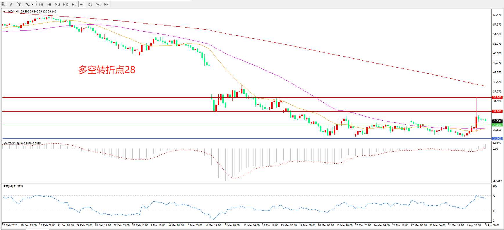 4小时图看,布油长阳拉升,突破前期整理区间,整体走势有所回暖,28美元成为短期支撑,短期均线走平,MACD红柱增加,RSI指标走平,日内延续上行概率较大。