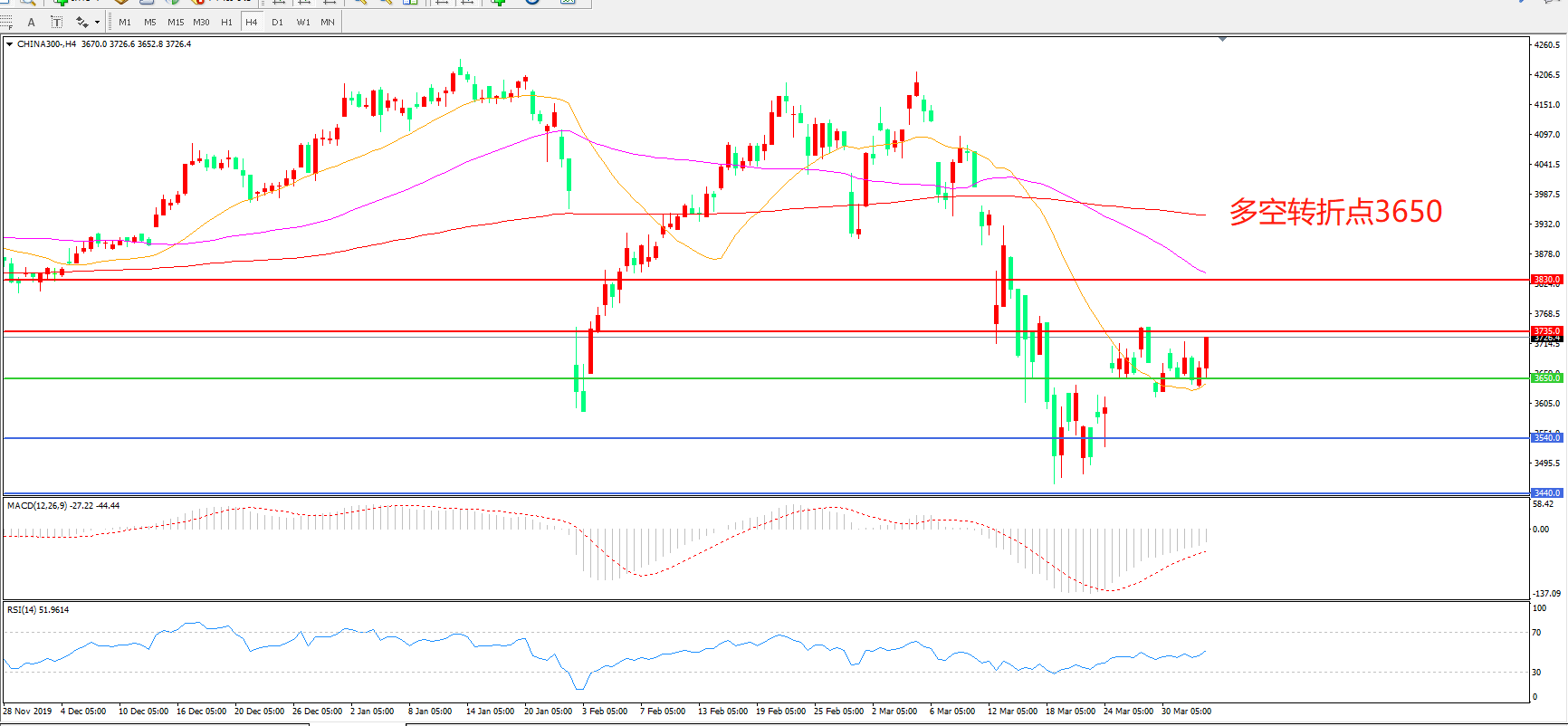 4小时图看,沪深300阳线连续拉升,整体表现偏强,均线系统逐渐走平,MACD绿柱缩短,RSI指标走平,日内延续上行概率较大。