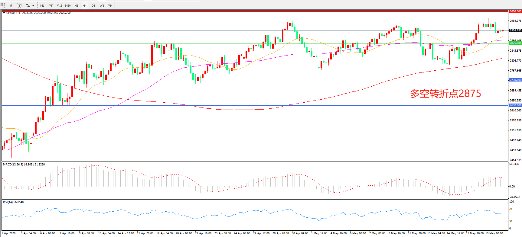 4小时图看,标普500延续高位震荡,整体表现回暖,2875一线成为短期支撑,2930一线成为上方阻力,均线系统走平, MACD红柱减少,RSI指标走平,日内延续震荡概率较大。